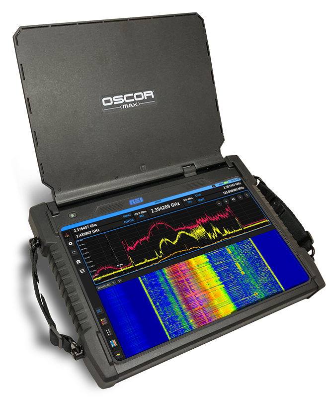 The completely new portable OSCOR Max spectrum analyzer covers 10kHz to 43GHz automatically switching across the built-in antenna system, sweeping 1100GHz per second at 10kHz resolution. The body style, large touchscreen display and powerful GUI render signal data for known, unknown, interfering, disruptive or unauthorized signals and wireless threats of all types, including WiFi and Bluetooth.